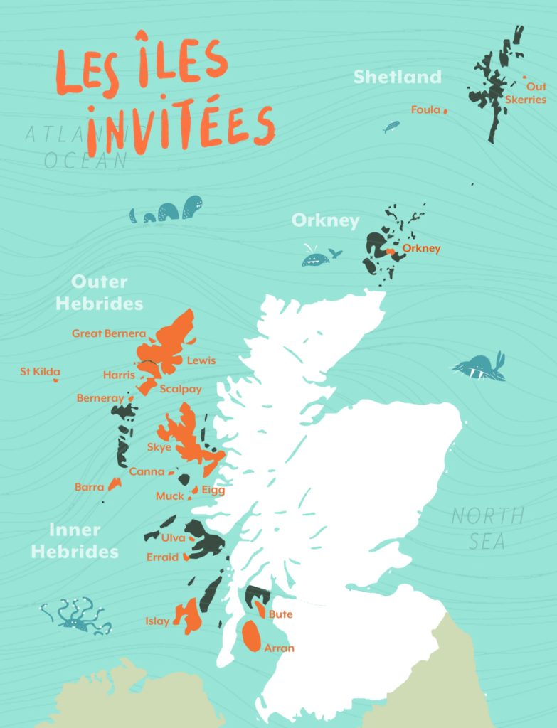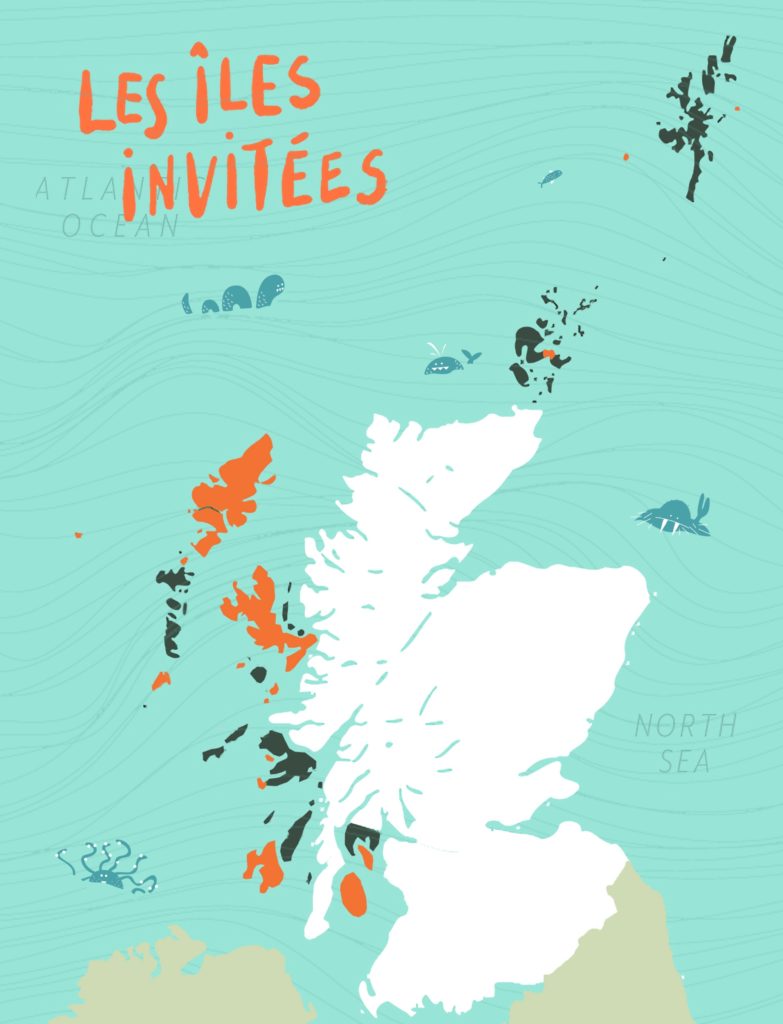 « Pour cette illustration, je me suis inspirée de l’idée de connexion entre les archipels d’îles que l’on trouve autour des côtes écossaises, mais aussi de l’idée des liens créés entre les îles dans le cadre du festival. Outre les thèmes plus littéraux, de l’énergie, de la communication et du transport, qui continuent à être des points de défi et d’intérêt à travers les îles, j’étais aussi plus généralement intéressée par l’idée d’une connexion partagée dans l’expérience de celles et ceux qui vivent sur les îles.